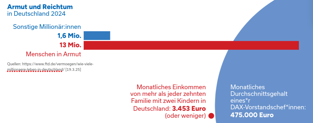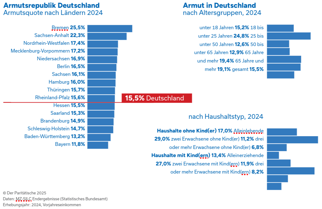 Armut bringt die Kritik an der ungerechten Verteilung von Lebenschancen auf den Begriff. Mitten in einer reichen Gesellschaft gibt es Menschen, denen eine normale Lebensführung unmöglich ist. Es fehlt ihnen schlicht und einfach das Geld, um einen normalen Lebensstandard zu finanzieren. Nach den jüngsten Befunden im Paritätischen Armutsbericht 2025 sind 13 Mio. Menschen oder 15,5 Prozent der Menschen in Deutschland arm. Konsequenterweise ruft der Paritätische Gesamtverband die Bundesregierung dazu auf, die Bekämpfung von Armut und sozialer Ausgrenzung jetzt ganz oben auf die Agenda zu setzen.