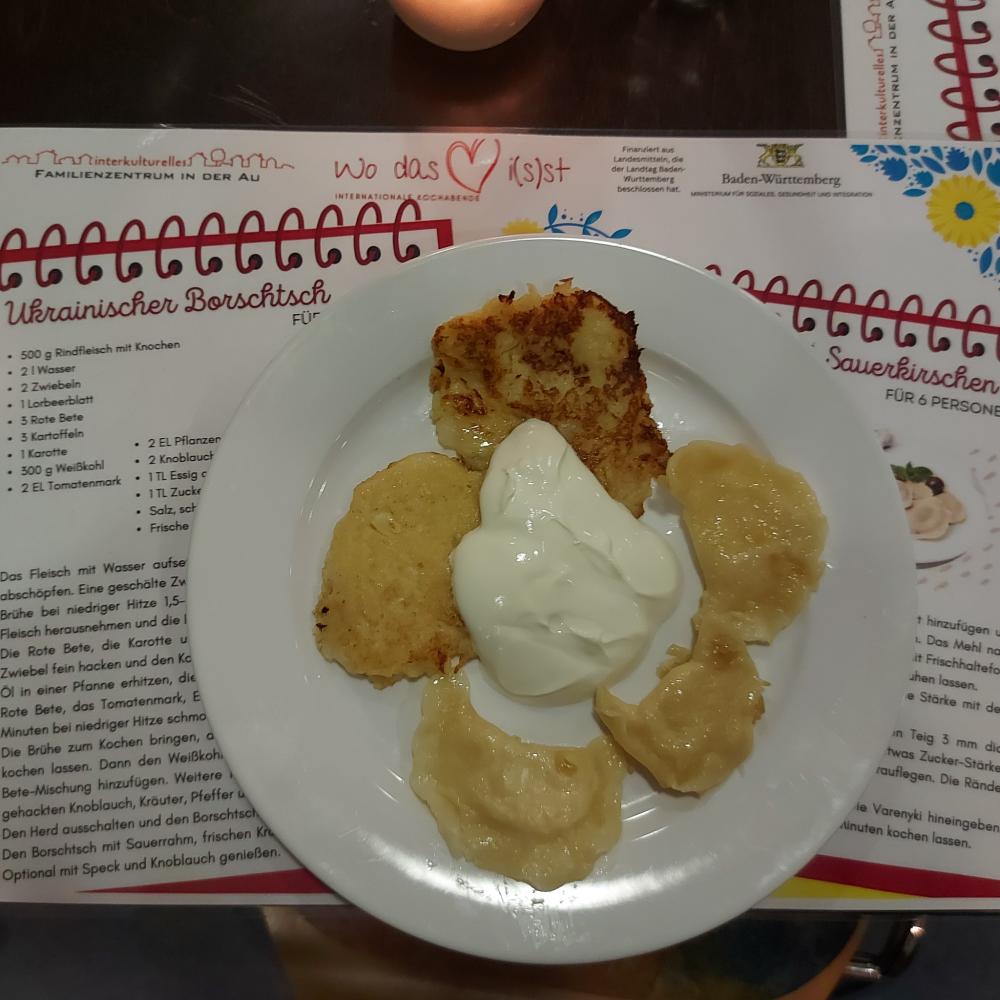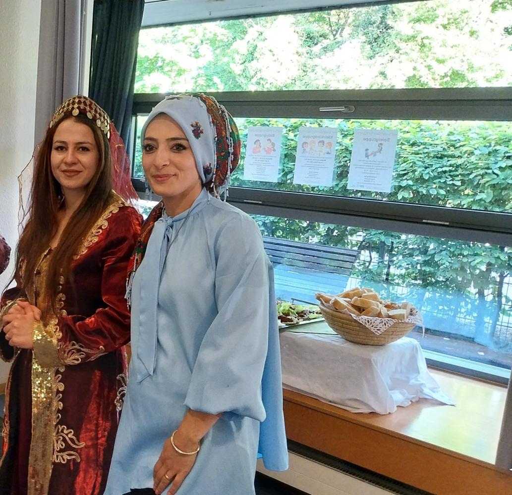 Die jesidischen Frauen hielten eine tolle Powerpoint-Präsentation. Die Syrerinnen führten Tänze vor, deren Bedeutung für die Gemeinschaft sie erläuterten. Zum Thema ‚vegetarische Gerichte des Orients’ kochten irakische und syrische Frauen gemeinsam. Die Rezepte liegen als Platzsets unter dem Teller, dürfen mitgenommen werden. Berichte und Bilder in den Medien über Zugewanderte, Geflüchtete, Migrant*innen schaffen Distanz, stigmatisieren Menschen als Fremde. Wenn man dagegen an einem Tisch sitzt, zusammen isst, sich erlebt, sich direkt authentisch austauscht, wird man differenzierter. Das ist durch nichts zu ersetzen.