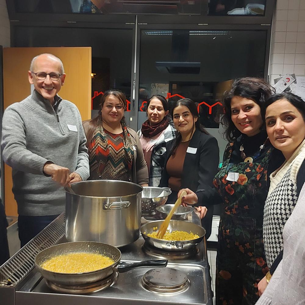 Unsere Erfahrungen – nach nun fünf Kochabenden von insgesamt zehn – sind durchweg positiv. Wir haben schon Stammgäste aus der Politik. Zehn bis fünfzehn Leute kommen meist zusammen, oft auch noch weitere Frauen aus unseren Kursen. Die Gäste dürfen mit schnippeln und mit rühren – sie lernen von den Frauen. Die Köchinnen stammen aus verschiedenen Herkunftsländern, etwa aus dem Iran, Irak, aus Afghanistan, der Türkei, der Ukraine. Das Land und seine Esskultur ist Thema des Kochabends. Die Kursleiterinnen bereiten dies vor, üben Vokabeln mit den Frauen. Viele stehen erstmals vor anderen, halten ein Referat über ihr Land. Manche sind bei uns in Alphabetisierungskursen, holen Bildung nach. Auch sie wagen es, spüren Selbstwirksamkeit, Anerkennung, merken, dass sie Menschen begeistern können.