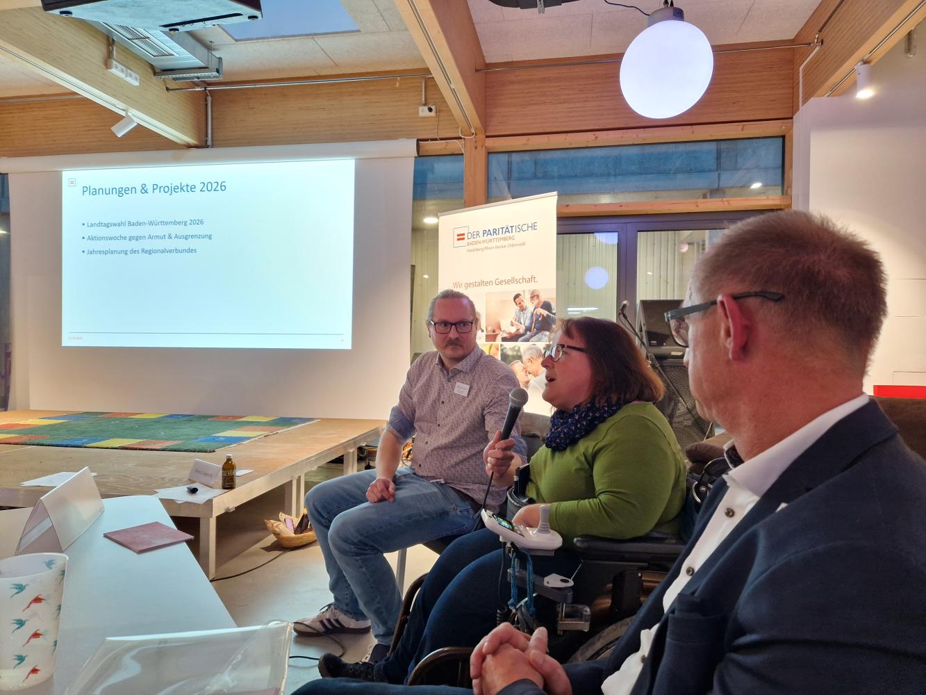 Ein besonderer Austausch war das Gespräch mit dem Landesverband der Gehörlosen Baden-Württemberg. Einem wichtigen Mitglied, mit dem wir in vielen Fragen der Inklusion eng zusammenarbeiten. Im Besonderen hatten wir die Frage nach dem Bedarf an Gebärdensprachdolmetscher*innen gesprochen. Hier auf dem Bild: Vorstandsmitglied Gerald Schneider (Mitte) und Philip Bleicher (Rechts), Mitarbeiter der Geschäftsstelle des Landesverbands.