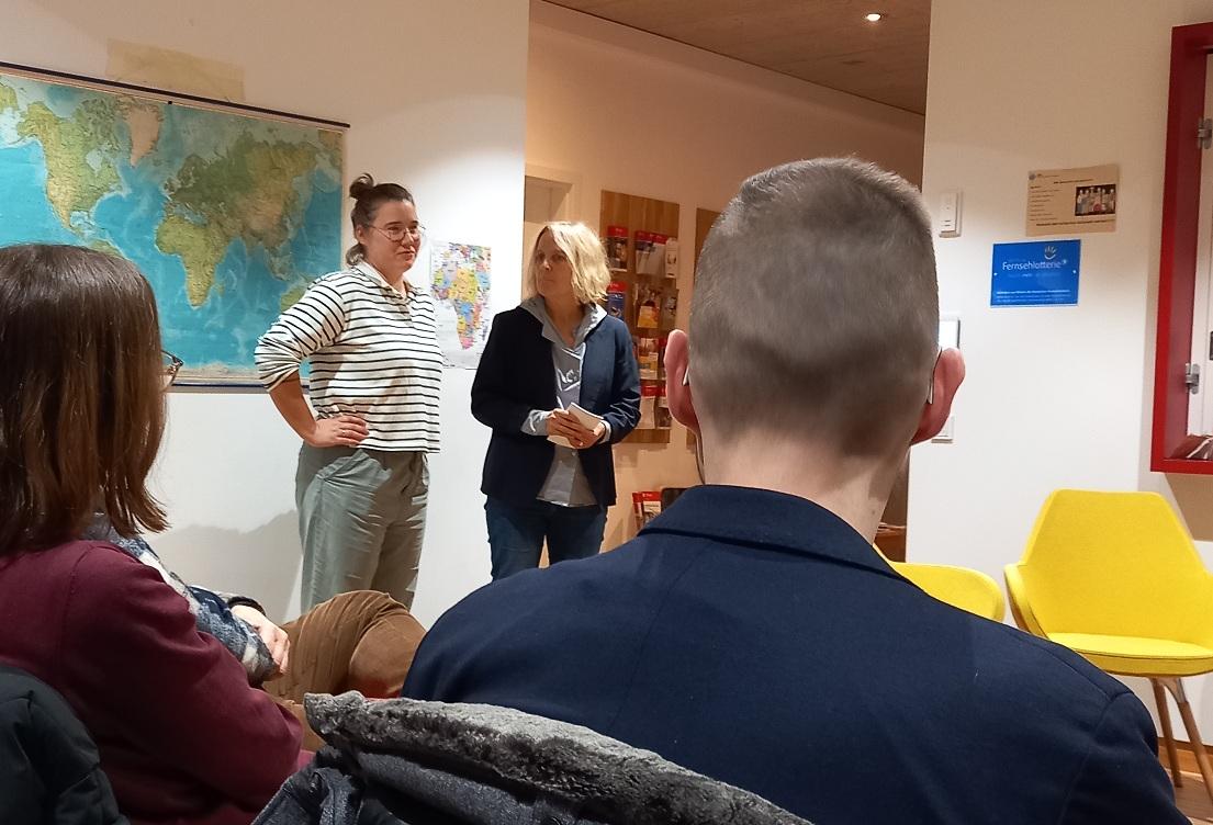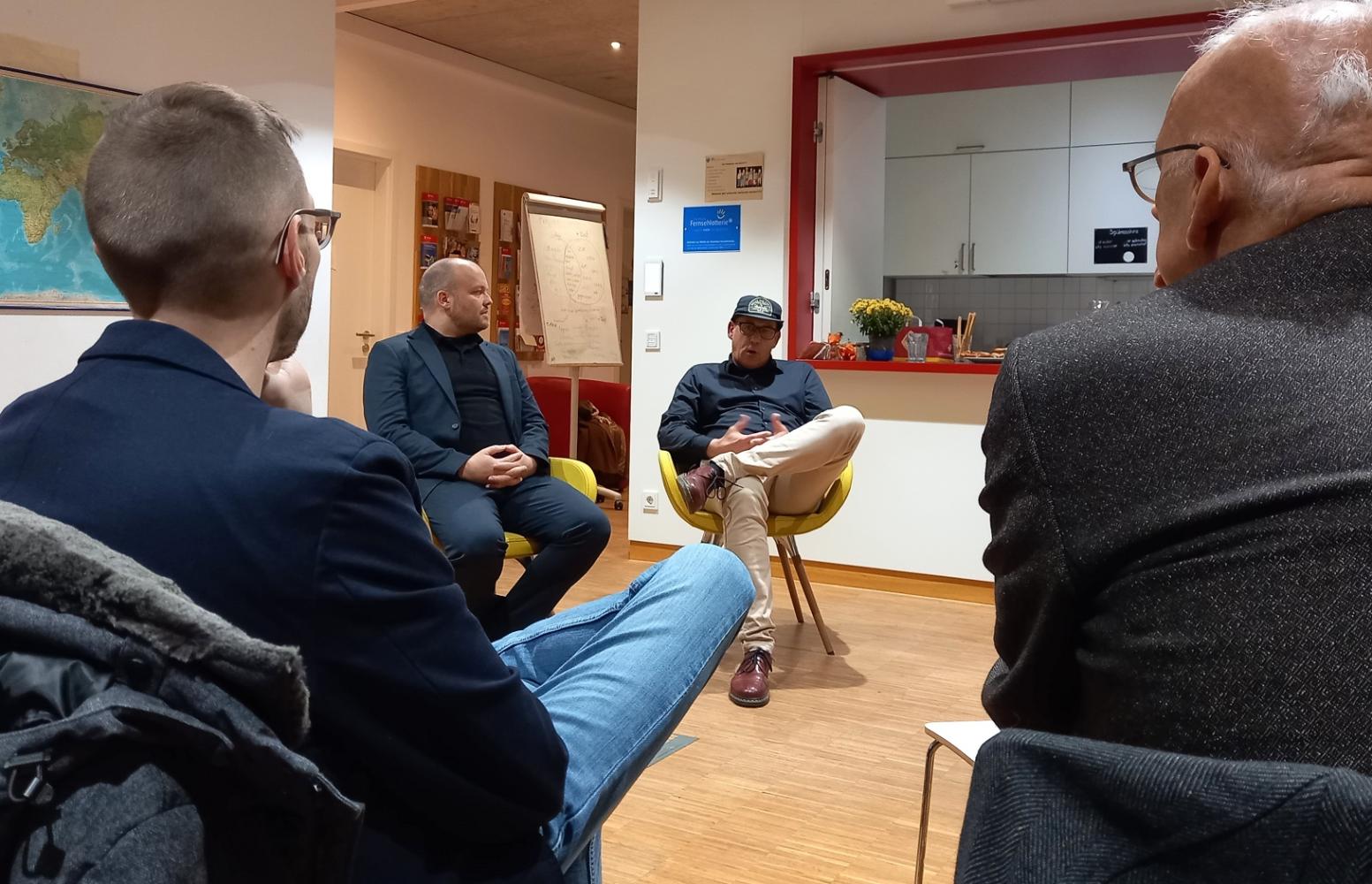 Thorsten Neumann und Sebastian Niklasch, Bereichsleitungen der Einrichtung in Nordrhein-Westfalen, schilderten im Gespräch mit Brigitte Ströbele (Aidshilfe Reutlingen-Tübingen e.V.) und Laura Küssner (BWLV Drogenhilfe Tübingen gGmbH) eindrucksvoll ihre Erfahrungen im Betreiben einer solchen zwischenzeitlich umständehalber auf Menschen mit Suchterkrankung spezialisierten Pflegeeinrichtung: So beschrieben sie die Herausforderungen der speziellen Klientel, die „einen anderen Humor, andere Kleidung und ein anderes Verhalten an den Tag legt – manchmal ist die Musik dort halt einfach laut“. Dass hierfür eine Akzeptanz der anderen Mitbewohner und auch der Mitarbeitenden notwendig ist, um die damit einhergehenden Konflikte regeln zu können, ist einleuchtend. Dass mit einer entsprechenden akzeptierenden Einstellung aber auch die Würde der Betroffenen erhalten bleiben kann, wurde ebenso deutlich: Ein Pflegebedürftiger, der aufgrund seiner Suchterkrankung sein Verhalten weniger kontrollieren kann und z.B. die Angewohnheit hat, auf dem Balkon seines Zimmers zu urinieren, wird in standardisierten Einrichtungen vielleicht als Skandal wahrgenommen. In Haus Maria Veen wird diese Person „dann halt in ein hinteres Zimmer verlegt, wo das Verhalten nicht so viel Anstoß erregt“. Überhaupt wird dort zum einen mit einem konsum-akzeptierenden Ansatz gearbeitet – „das Ziel muss nicht immer Abstinenz sein“; zum anderen wird generell auf der Beziehungsebene und nicht mittels Sanktionen versucht Einfluss auf das mitunter schwer kontrollierbare Klientel Einfluss zu nehmen.