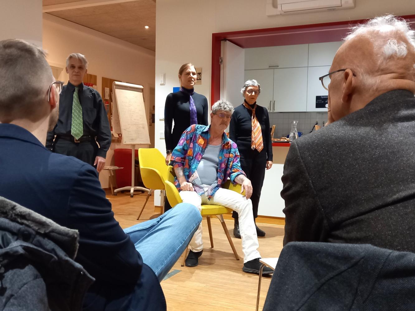 Die Veranstaltung wurde eröffnet durch die Wilde Bühne Stuttgart, die eine eindrückliche theatralische Darstellung der unterschiedlichen Perspektiven und Zugänge zum Thema bot: Einerseits der betroffene Mensch mit all seinen Zweifeln und Nöten, andererseits die (visuell wortwörtlich dahinter stehenden) Zwänge des Systems und die Ambivalenz der Betreuenden, die sich immer wieder im überlagernden Sprechchor vermischten und aufschaukelten.