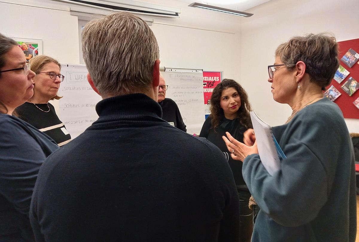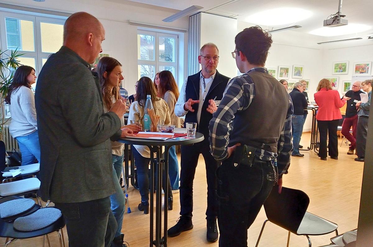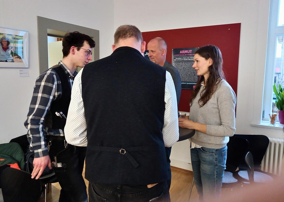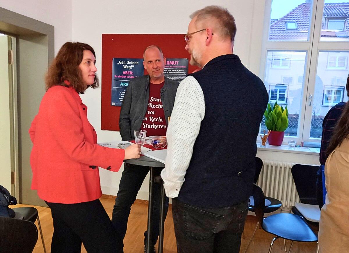 Diana Arnold (CDU), Dorothea Kliche-Behnke (SPD), Daniel Lede Abal (B90/ Die Grünen), Tom Besenfelder in Vertretung von Katharina Poppei (Die Linke) und Irene Schuster (FDP) sagten ihre Teilnahme sofort zu. Auch der Zulauf auf Seiten des Sozialwesens war groß: Über 30 Personen fanden sich bei der kit-Jugendhilfe ein, um ins Gespräch mit den Kandidierenden zu gehen. Da Interesse am fachlichen Austausch aus den unterschiedlichsten sozialen Sparten angemeldet worden war, kündigte Fabienne Christen, Regionalleitung Neckar-Alb des Paritätischen Wohlfahrtsverbands, ein Format in der Manier eines „politischen Speed-Datings“ an – viele Kontaktmöglichkeiten und eine Vielzahl an inhaltlichen Informationen und Fragen, mit der Möglichkeit, im Anschluss an die Veranstaltung vertieft in den Kontakt zu gehen. Nach einem kurzen Einstieg zur Bedeutung des Sozialwesens als Ganzes wurde an fünf Thementischen mit Vertreter*innen von jeweils zwei sozialen Einrichtungen 10 Minuten lang mit einem Kandidierenden diskutiert, informiert und nachgefragt. Anschließend wechselten die Kandidierenden an den nächsten Tisch, bis nach 60 Minuten alle fünf Gesprächsrunden absolviert waren. Dorothea Kliche-Behnke fasste entsprechend zusammen, dass sie soeben durch ein buntes Sammelsurium an sozialen Fachbereichen geeilt sei, das sie sich mühsam in 18 Jahren kommunal- und landespolitischer Tätigkeit erschlossen hatte. Gerade für die Neulinge unter den Kandidierenden war das Format demgemäß herausfordernd. Dennoch meisterten alle fünf Politiker*innen die Veranstaltung vorbildlich: Es wurde an den Tischen mit Interesse nachgehakt, politisch Stellung bezogen und manches in Kontrast zu den politischen Realitäten gesetzt, obwohl definitiv Verständnis für die sachliche Notwendigkeit von politischen Anpassungen vorhanden sei. Abschließend erhielten die Kandidierenden die Gelegenheit im Plenum ihr jeweiliges Fazit und den Bezug zum Wahlprogramm zu formulieren. Hier legte Diana Arnold (CDU) einen Schwerpunkt auf die kostenlose frühkindliche Bildung, Entbürokratisierung und Hilfe durch verbesserte Digitalisierung. Irene Schuster (FDP) erwähnte unter anderem, dass durch mehr Vertrauen mehr Handlungsspielräume für soziale Einrichtungen entstehen sollten und von sozialen Härten Betroffene möglichst viel Wahlfreiheit haben sollten. Dorothea Kliche-Behnke (SPD) betonte, dass die ungleichen Lebensverhältnisse gesellschaftlich schwierig seien; zudem brauche es mehr vom Land initiierte und kontrollierte Standards im Sozialwesen. Auch die Bedeutung von Prävention und einer bedarfsdeckenden Versorgung bei psychischen Krisen müsse politisch ernstgenommen werden. Daniel Lede Abal (B90/die Grünen) wiederum machte sich stark dafür, von der Projektfinanzierung hin zu einer verlässlichen und nachhaltigen finanziellen Ausstattung zu gelangen. Außerdem sprach er offen aus, dass mehr Geld, auch für die Kommunen, notwendig sei für ein funktionierendes Sozialwesen. Hier dockte auch Tom Besenfelder (die Linke) an, der die belasteten Kommunalfinanzen ebenfalls als drängende politische Aufgabe benannte. Zudem seien generell faire Löhne die beste Prävention von sozialen Härten. Parteiübergreifend wurde betont, dass es politische Lösungen für die oft prekären Wohnsituationen brauche. Und auch, dass von den sozialen Einrichtungen erbrachte sogenannte Freiwilligkeitsleistungen mitnichten nur freiwillige – und somit verzichtbare – Angebote sind, wurde wiederholt von den Politiker*innen benannt. Vielmehr sind diese Ausdruck des grundlegenden Rechts auf soziale Teilhabe der Menschen und müssen dementsprechend auch weiterhin gestützt werden.