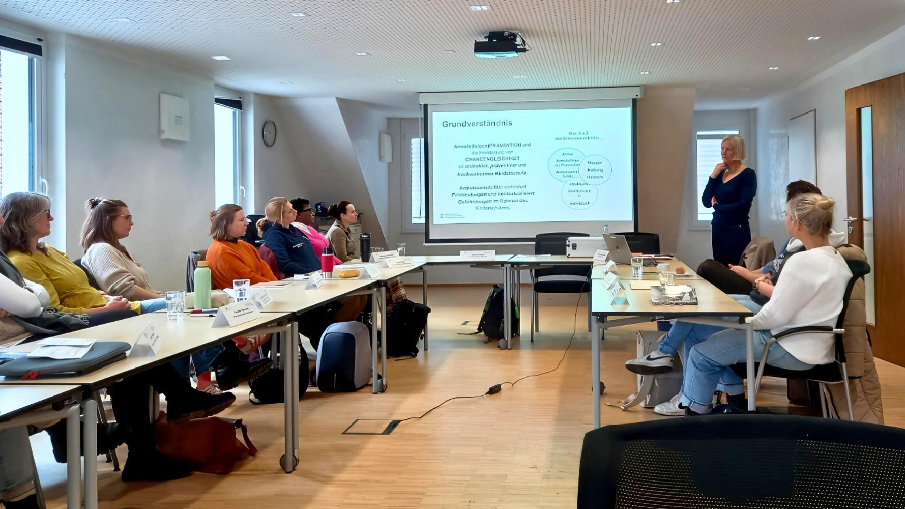 Ziel des Formats war zu verstehen, inwiefern Kinderarmut zu Kindeswohlgefährdungen beitragen kann und was die eigene Institution und das eigene Handeln verändern können. Als Referentin war Dr. Antje Richter-Kornweitz extra aus Oldenburg angereist. Das Ministerium für Soziales, Gesundheit und Integration des Landes Baden-Württemberg, das die Veranstaltung bereitstellte und finanzierte, legte Wert auf höchste Expertise: Dr. Richter-Kornweitz war über Jahre an der Entwicklung von Konzepten zum Aufbau von Präventionsnetzwerken gegen Kinderarmut in Deutschland beteiligt. Die durchweg hohe Fachlichkeit bemerkten die 17 Teilnehmenden in der Veranstaltung auch deutlich: Neben vielen Informationen und vermitteltem Wissen, wurde Raum gelassen für Diskussionen und andere Auffassungen oder Problematisierungen durch die Teilnehmenden. Die Notwendigkeit der Fortbildung wurde gleich zu Beginn anschaulich illustriert: Fr. Dr. Richter-Kornweitz erfragte diverse Ranking-Einschätzungen von den Teilnehmenden. Hier zeigte sich, dass Kinderarmut ein großes Thema in allen repräsentierten Einrichtungen ist. Dagegen konnte nur die Hälfte davon berichten, dass bereits ausführlichere institutionelle Auseinandersetzungen stattgefunden hatten. Das vermittelte Wissen war also sicher gewinnbringend. Vor allem wollte die Fortbildung aber Raum bieten, seine eigene Haltung und seinen höchstpersönlichen Zugang zum Thema Armut zu eruieren, um diese im weiteren professionellen Handeln entsprechend bewusst wahrnehmen und evtl. auch modifizieren zu können. Es gab also entsprechend viele Arbeitsphasen alleine und in der Gruppe, um dies zu ergründen. Und im letzten Teil der Veranstaltung lag der Schwerpunkt auf konkreten Handlungsplänen, die die Fachkräfte für sich und für die Abläufe in ihren eigenen Institution basierend auf den vermittelten Inhalten erarbeiteten. Insgesamt wurden sehr dicht Inhalte, Probleme und Implikationen von Kinderarmut und ihren Folgen behandelt, sodass eine umfassende Zusammenfassung kaum möglich scheint – zumal der persönliche Zugang auch sehr unterschiedlich war. Doch wurde wiederholt deutlich, dass z.B. ein unbewusstes Klassieren zwischen „Wir Fachkräfte und die“ ein Risiko für die Wirksamkeit der pädagogischen Arbeit darstellt. Auch der Begriff der Gleichwürdigkeit von Fachkraft und Klient*in war auf einer der präsentierten Folien zu lesen – die Aufforderung, Menschen in Armutslagen als Expert*innen ihres Alltags anzusehen, um mit ihnen gemeinsam an Erleichterungen zu arbeiten. Die Referentin ermutigte dazu, Empowerment und Partizipation ernst zu nehmen – Ermächtigung statt Mildtätigkeit in der sozialen Arbeit. Dass Armut oftmals unbewusst mit der Frage nach Schuld kombiniert wird, klang an einigen Stellen an. Was brauchen wir, um Kinderarmut in unserer Institution pädagogisch wirksam begegnen zu können? Arbeiten in Netzwerken wurde wiederholt als Ideal genannt – voneinander wissen und sich gegenseitig informieren anstelle von institutionsabgegrenztem Agieren. Aber auch kleine einfache Ideen wurden gemeinsam entwickelt, die die einzelne Fachkraft alleine umsetzen kann: Z.B. im Kindergarten nicht mehr in großer Runde davon erzählen zu lassen, wo die Kinder im Urlaub waren; stattdessen offener formulieren und z.B. danach fragen, was den Kindern in den Ferien am meisten Spaß gemacht hat – und schon ist ein kleinerer Geldbeutel nicht mehr so bedeutsam. Oder Informationen für Familien in Armutslagen nicht mehr gezielt an einzelne Personen zu adressieren, sondern einfach an alle austeilen, um unbeabsichtigte Stigmatisierung zu vermeiden. Denn auch eines klang wiederholt an: Armut ist nicht immer nur dort vorhanden, wo man sie – auch aufgrund von persönlichen Vorerwartungen – vermutet: Oftmals ist sie unsichtbar und nach außen nicht zu erkennen. Es braucht also Sensibilität in vielerlei Hinsicht. Die Fortbildung hat sicher dazu beigetragen, diese zu schulen.