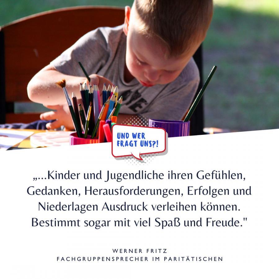 Herzstück der Kampagne war ein Kreativwettbewerb, an dem junge Menschen zwischen 6 und 20 Jahren, die von Paritätischen Mitgliedsorganisationen im Rahmen der Kinder- und Jugendhilfe betreut, begleitet oder gefördert werden, teilnehmen konnten. Auf verschiedene Art und Weise sollten sie ihre Erlebnisse, Erfahrungen und Sorgen zum Ausdruck bringen können. Dies reichte von gemalten Bildern, geschriebenen Texten, Fotos, Liedern bis hin zu Videobeiträgen.